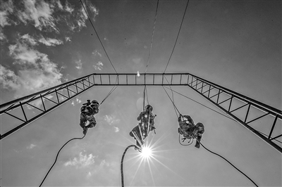 这幅作品拍摄的是第73集团军某旅组织侦察兵开展武装攀登训练的场景。拍摄者采用广角镜头仰拍的方式,记录下官兵头顶烈日、火热练兵的画面。作品主题突出,构图简洁,具有视觉冲击力。