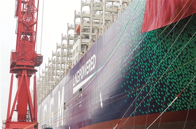 5月26日,载箱量达23000TEU的超大型双燃料集装箱船“达飞·特罗卡德罗”号,在上海命名交付给法国达飞海运集团。该船入级法国船级社,总长399.9米,型宽61.3米,航速22节,载重量近22万吨,是当之无愧的“海上巨无霸”,将于5月29日从中国驶往北欧,投入到达飞亚欧航线FAL1运营中。图为“达飞·特罗卡德罗”号。新华社发