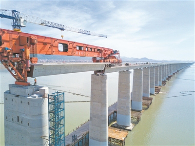 7月11日,我国自主研发的“昆仑号”千吨级运架一体机在中铁十一局承建的新建福厦铁路湄洲湾跨海大桥建设现场,圆满完成最后一孔40米高铁箱梁架梁任务。“昆仑号”是目前世界唯一的千吨级运架一体机,自2020年首次在新建福厦铁路湄洲湾跨海大桥建设现场亮相以来,共架设40米高铁箱梁298孔。 新华社发
