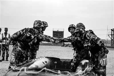 近日,海军某部开展群众性练兵比武,全面检验官兵综合能力。图为抬冲锋舟课目比武前,参赛队员相互加油鼓劲。王 玮摄