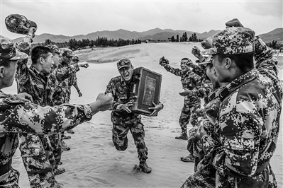 7月下旬,北京卫戍区某团侦察连官兵利用训练间隙开展小比武。图为弹药箱接力赛时,列兵宋家程在大家的助威声中冲过终点。 张明正摄