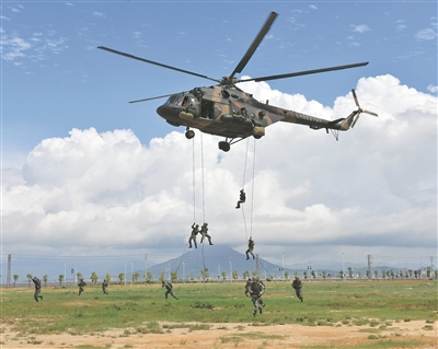 8月15日,东部战区陆军某旅组织实兵战术演练。图为官兵快速索降。