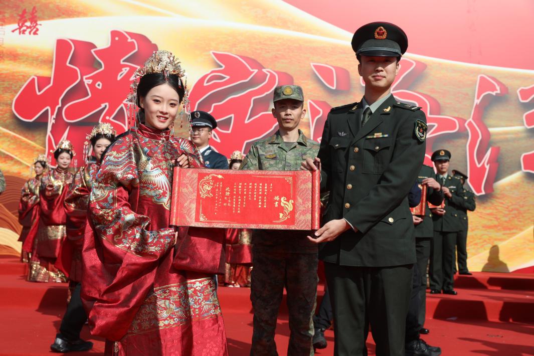 上午10时,锣鼓震天、吉狮欢舞,80对新人手挽手,缓缓踏上红毯。婚礼仪式正式开启,“却扇纳祥”环节中新娘将团扇交予新郎,象征携手开启新生活;“礼拜天地”环节中,一拜感恩祖国护佑山河无恙,二拜感恩父母养育与部队培养,三拜感恩彼此相许守诺言;紧接着“喜印婚书”,彰显新人们“执子之手,与子偕老”的决心;再行“合卺成喜”,寓意未来甘苦与共;最后“执手盟誓”,以庄重承诺定格幸福时刻。