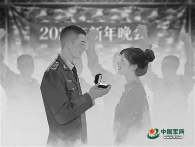 节目表演完毕,杨光恺深吸一口气,示意战友们按计划行动。杨光恺的主持人搭档朗声说:“最后的特别环节,是我们的战友为一位姑娘精心准备的……”