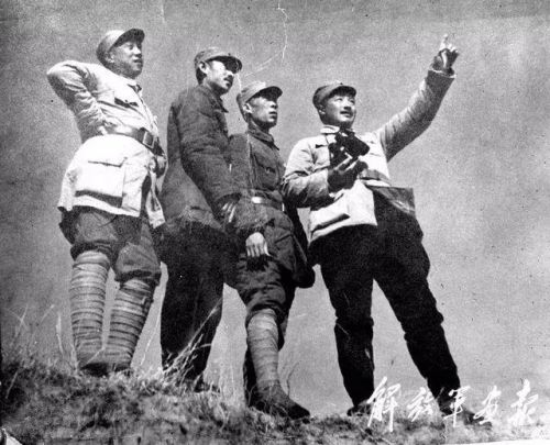 贺龙(右一)与周士第(右二)、关向应(右三)、甘泗淇(右四)在雁门关前线观察地形