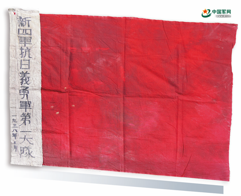 这面落款为1938年7月的旗帜,红色旗面已经褪色,左侧“新四军抗日义勇军第一大队”的字迹却清晰可辨。