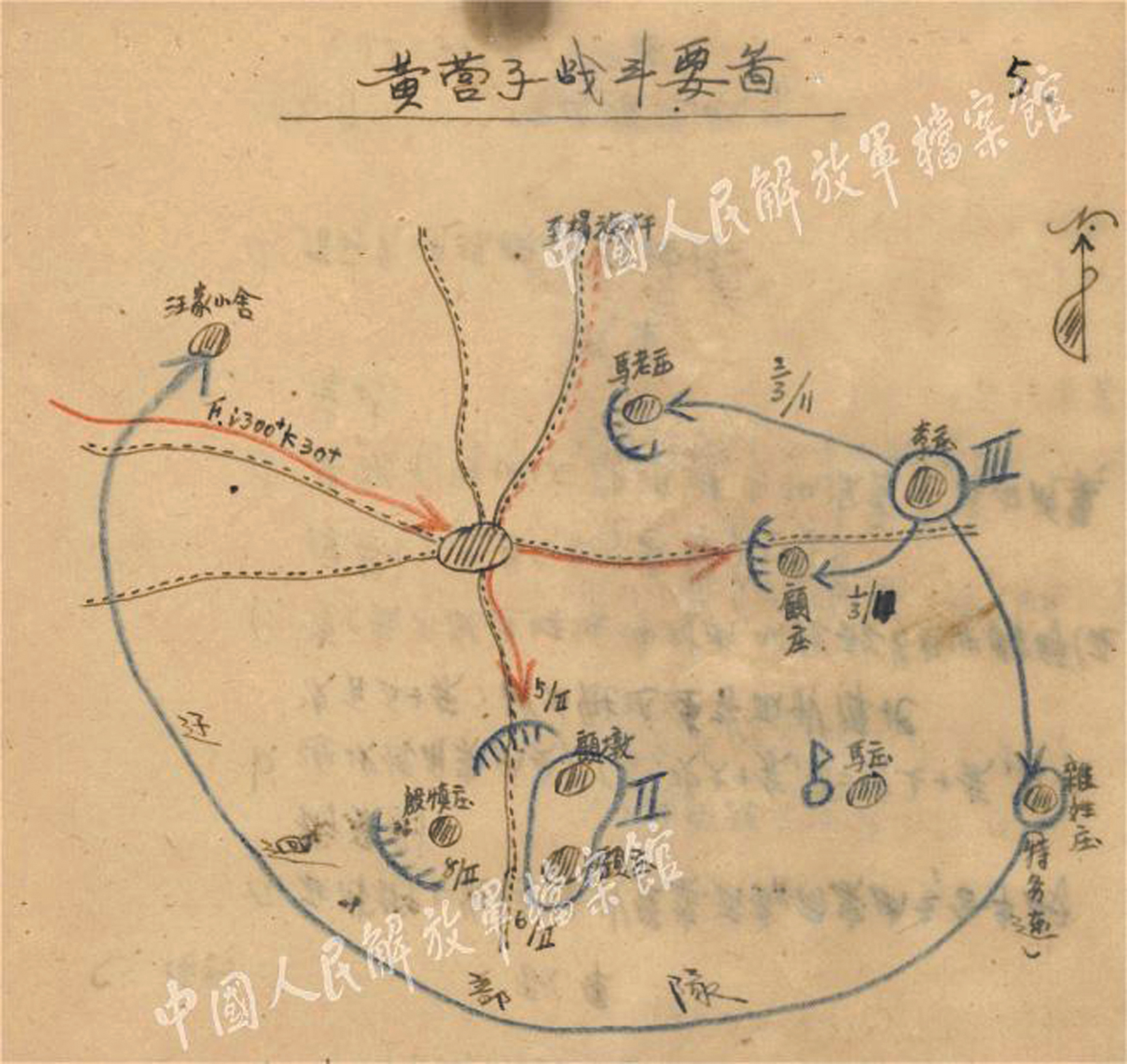 一九四三年新四军司令部《盐阜分区反扫荡战役详报》内页之黄营子战斗要图。