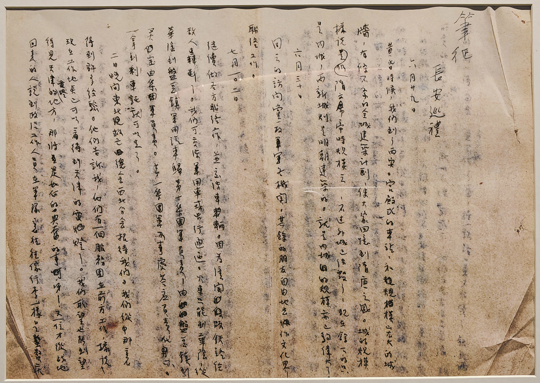 1938年3月27日,中华全国文艺界抗敌协会在汉口总商会礼堂正式成立,提出“文章下乡,文章入伍”的口号,鼓励文艺工作者深入农村、深入战地前线去“战斗”。爱国诗人王礼锡率领的作家战地访问团成为响应口号的文化团体之一。该团于1939年6月18日出发,深入晋、冀、豫、陕等地,在民众中走访,用诗歌、小说、戏剧、散文、图画等形式将敌后军民可歌可泣的英雄事迹呈现出来。王礼锡不仅参与访问团写集体日记的任务,还坚持写个人日记。现存的27篇日记,具体生动地记录了他战地征途的所见所闻,留下了珍贵的抗战史料。2024年,《笔征日记》被评为国家一级文物。(王艾涛摄于中国现代文学馆)