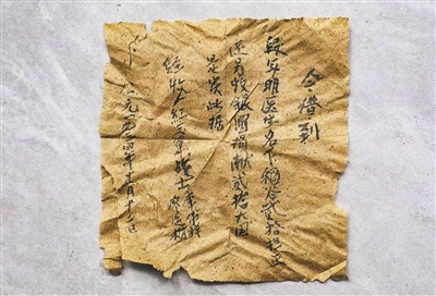 得知笔者来意,段元法小心地从柜子里取出一个竹筒和一个军马铃铛。他打开竹筒,两张泛黄的毛边纸呈现在眼前,上面清晰可见毛笔写就的字迹。摩挲着老物件,段元法向笔者讲起那段老一辈口口相传的往事。
