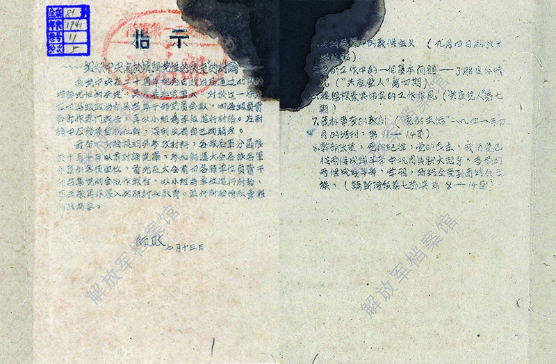 八路军第129师政治部于1941年7月13日作出《关于组织“中央关于增强党性的决定”的讨论》的指示。解放军档案馆藏