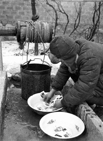 翻阅我军历史资料图片,看到两幅记录战争年代军事新闻工作者执行任务的老照片。其中一幅拍摄于解放战争攻克汤阴的战斗间隙,一名军事记者在战壕中席地而坐进行采访,旁边还有一名战士在观察敌情(图①)。另一幅中,华北某地冰天雪地,寒气刺骨,《晋察冀画报》的一名新闻工作者正蹲在一个水井旁,神情专注地洗印照片(图②)。从图片说明得知,该图亦拍自战斗前线。