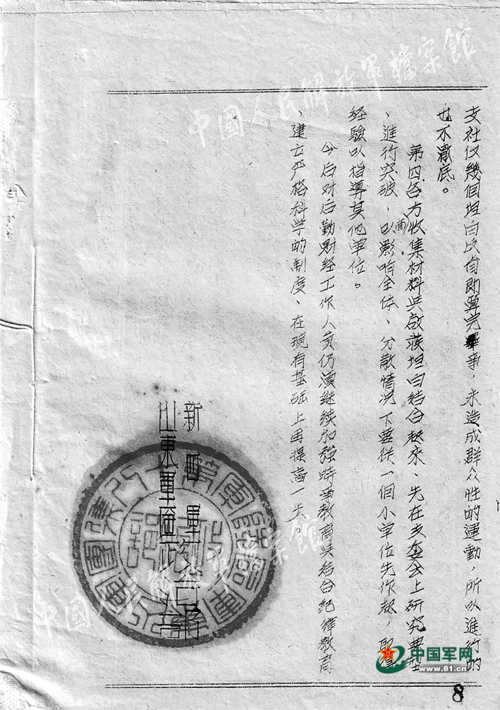1946年12月,新四军兼山东军区政治部转发鲁中军区政治部关于后勤部前卫合作社开展反贪污斗争的坦白运动总结通报。解放军档案馆提供