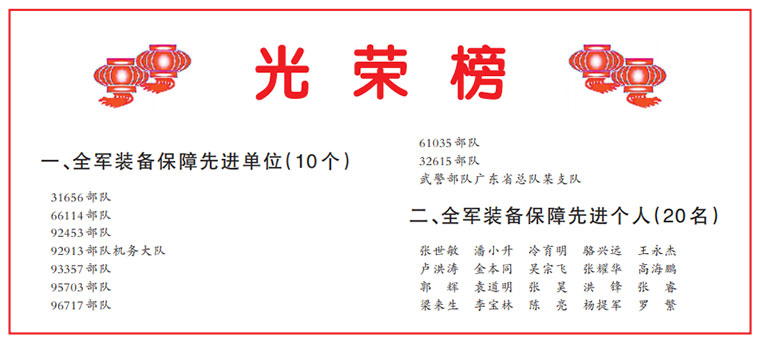 新华社北京1月14日电 日前,中央军委印发《关于表彰全军装备保障先进单位和个人的通报》,对10个先进单位、20名先进个人予以表彰。