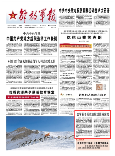解放军报讯 记者孙兴维、通讯员胡藕馥报道:2020年12月底,一架厦门航空公司的包机搭载一批新兵,平稳降落在新疆某机场。至此,全军2020年新老兵航空投送工作顺利结束。中央军委后勤保障部运输投送局负责人表示,在民航部门的大力支持下,经过军地共同努力,此次任务圆满完成,为常态化疫情防控条件下做好新老兵航空投送工作积累了经验。