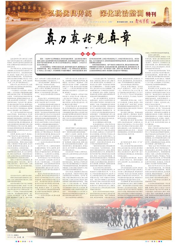 作为马克思主义武装起来的人民军队,从浴血奋战的革命战争年代到奋斗强军的新时代,在不同历史时期和发展阶段,为了解决思想认识、作风纪律等方面存在的矛盾问题,都真真正正拿起政治整训这把“手术刀”,自我检视、自我剖析,在真整真训中锤炼锻造,始终保持了人民军队的本真本色。