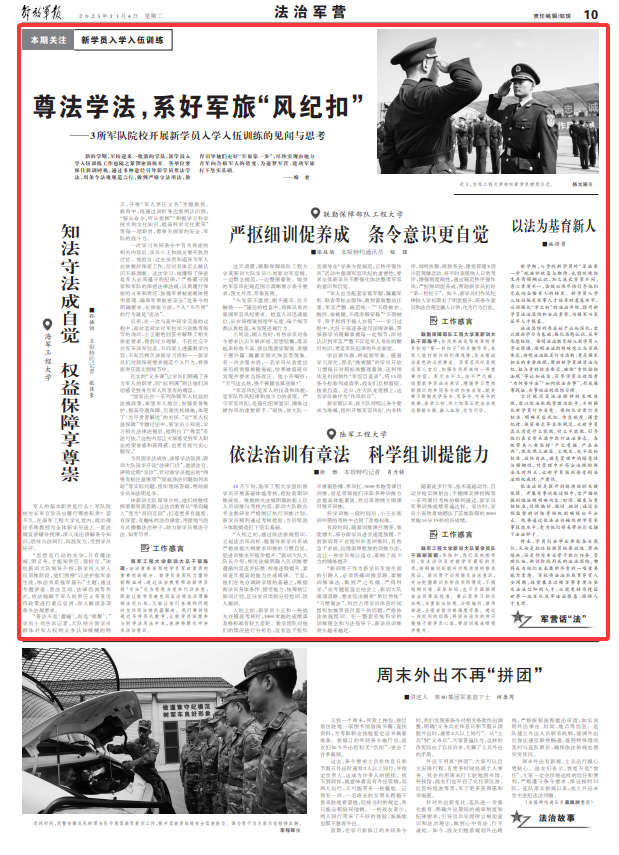 新的学期,军校迎来一批新的学员,新学员入学入伍训练工作也随之紧锣密鼓展开。各单位要抓住新训时机,通过多种途径引导新学员尊法学法,用条令法规规范言行,做到严格守法用法,教育引导他们走好“军旅第一步”,尽快实现由地方青年向合格军人的转变,为逐梦军营、建功军旅打下坚实基础。