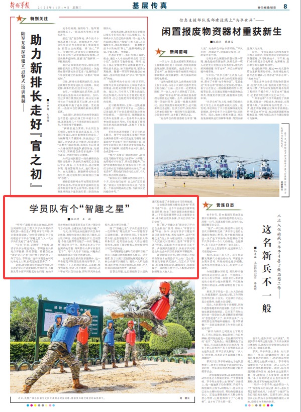 据了解,“智趣之星”理论学习平台已在全校推广使用,并纳入“军营学习通”平台。如今,该校学员学习理论不再只是依靠书本、板报与课件,运用“智趣之星”线上参与理论闯关、与智能数字人沉浸式对话研讨、登录“军营学习通”听课,日渐成为大家的学习新手段。多份测试数据显示,该校学员对理论应知应会知识点的掌握率不断提升。