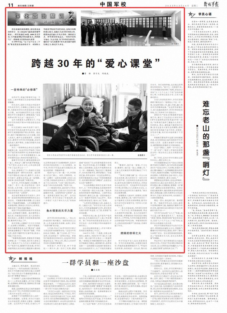 从老人所讲的故事中,学员们汲取源源不断的动力。“砥砺初心不在一时一地,而是要深植心灵,融入实践,融入每名学员的精神血脉。”在这所传承着红大、抗大血脉的院校中,学员们传承优良传统,在工作和学习中发扬光大。