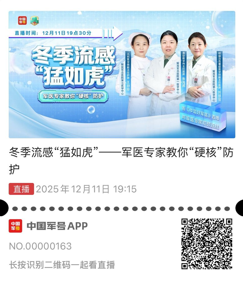 冬季流感来势汹汹!鼻塞、咳嗽、肺炎、反复发烧怎么办?流感和普通感冒如何区分?哪些是必须警惕的流感重症信号?……12月11日晚19:30,中国军号《中国好军医》直播间将邀请解放军总医院专家团队:第一医学中心急诊医学科主任医师朱海燕、第七医学中心儿科医学部副主任护师王自珍、第八医学中心呼吸与危重症医学部副主任医师刘慧莹三位权威专家,为您全方位解析流感的科学防护、症状应对和居家护理。