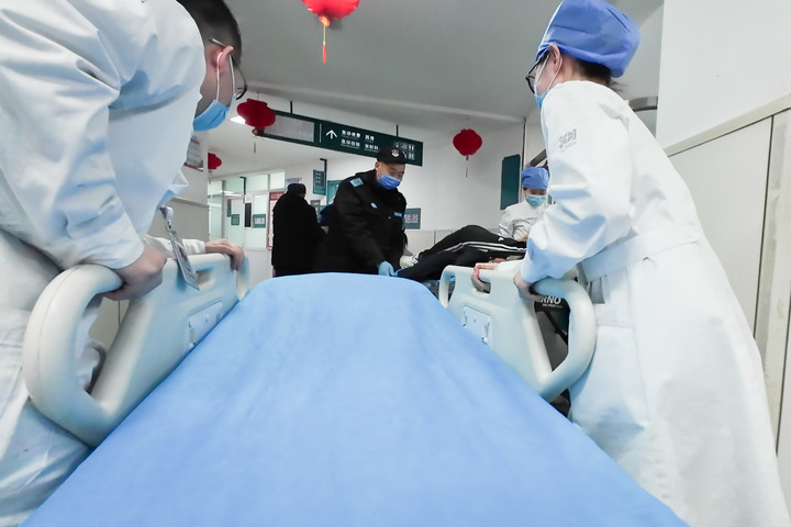 大年初一,安静的夜色被蓝色警示灯划破。一辆120救护车急停在急诊大厅门外。两名急救员推着一位昏迷不醒的患者进入急诊大厅,直奔抢救室,神色焦急的家属跟在旁边。