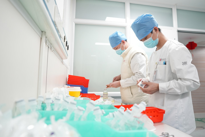 2月17日,在解放军总医院第四医学中心急诊医学科护师孙兆章(右)与同事调配药剂。新华社发(韩启扬 摄)