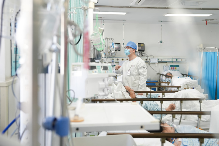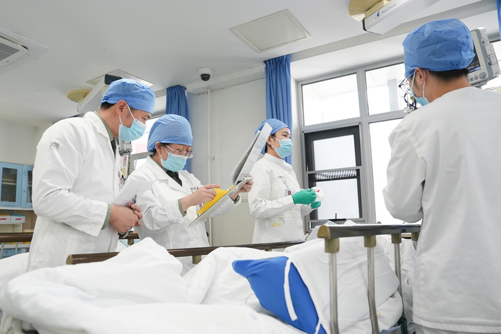 2月17日,解放军总医院第四医学中心急诊医学科副主任医师刘红升(左二)在抢救室查房。新华社发(韩启扬 摄)
