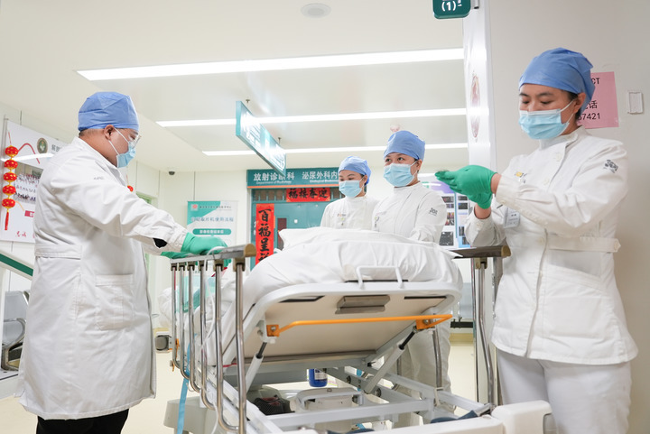 2月17日,解放军总医院第四医学中心急诊医学科护师喻俊(右二)与同事一起转运患者。新华社发(韩启扬 摄)