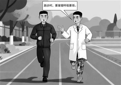 跑步前后注重呼吸预热和恢复。冬季室内外温差大,如果跑步时突然吸入大量冷空气,容易刺激呼吸道,诱发咳嗽,甚至损伤呼吸道黏膜。因此,战友们冬季进行跑步训练前,先要给呼吸系统“热热身”。起跑前,可以在室内或避风处做几次深长而缓慢的腹式呼吸,让呼吸肌群逐渐进入状态。同时,将腹式呼吸融入慢跑中,提高心肺的适应性,避免突然运动导致呼吸急促。而且,在跑步的初始阶段,建议大家尽量用鼻子呼吸。用鼻子吸气时,鼻腔能对吸入的空气进行预热、加温和湿润,避免冷空气直入肺部,鼻腔内的黏液和鼻毛还可以阻挡空气中的灰尘和细菌,对呼吸道起到一定的保护作用。有的战友在跑到一定程度后,只用鼻子呼吸不能满足需要,就会加上口呼吸。需要注意的是,用口呼吸时,舌头要顶住上腭,让空气通过舌头两侧进入。这样可以让吸入的冷空气在口腔内暖化一下,减轻对呼吸道的刺激。跑步训练结束后,应继续慢走5分钟左右,同时均匀呼吸,让心率和呼吸逐渐恢复平稳,避免因突然停止运动导致脑部缺氧。