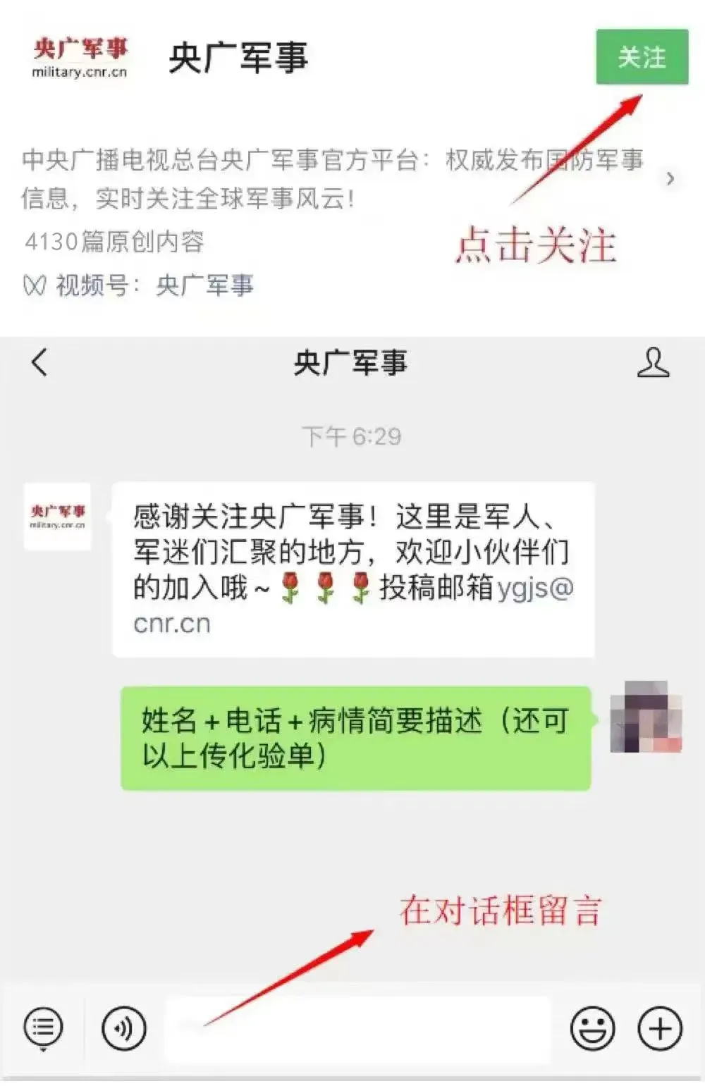 (2)直播过程中,可以继续在“央广军事”微信公众号后台留言,或在“中国军号”和“央广军事”微信、微博、央视频号《军医来了》直播互动区留言,写下您的“姓名+电话+病情简要描述”,我们将请专家为您现场答疑。