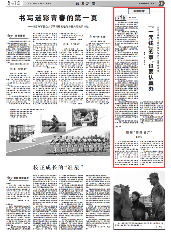 由“一元钱”带来的办实事举措,其深层意义在于党委机关主动发现问题、积极解决问题的态度,向官兵传递了一个明确的信号——官兵们的每一件小事,都是党委机关心头的大事。