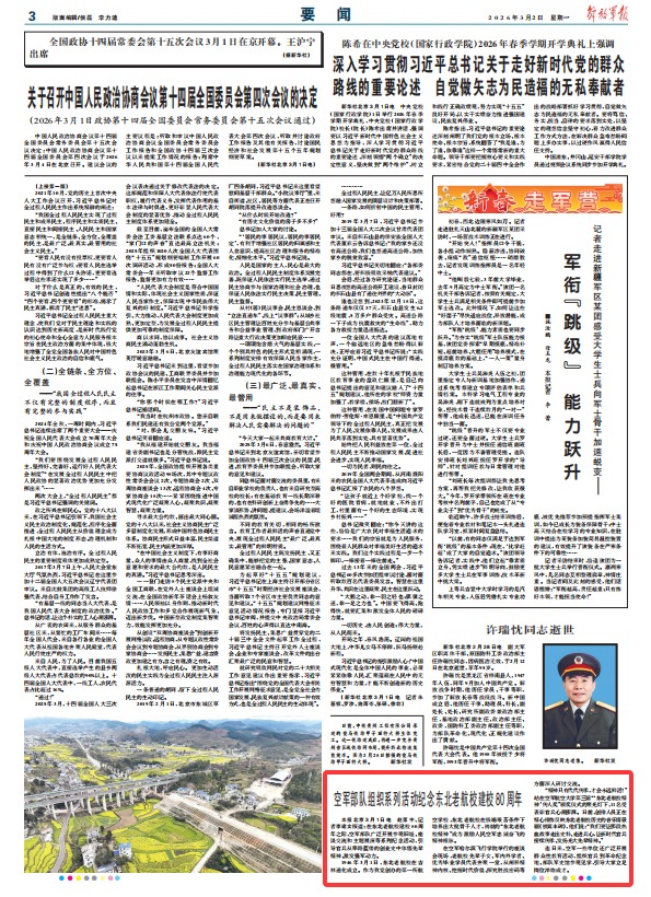 解放军报北京3月1日电 赵第宇、记者李建文报道:在东北老航校建校80周年之际,空军部队广泛开展参观旧址、座谈交流和主题展演等系列纪念活动,引导官兵从筚路蓝缕的创业史中体悟先辈精神、激发强军动力。