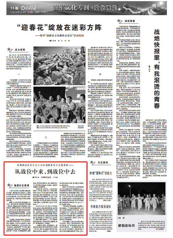 “我们是战斗的轻骑队,忠诚擎天,建功东南……”伴着嘹亮的歌声,这支由28名官兵组成的文艺小分队,在1个月内辗转20余个单位,将文艺情景课送到战训一线。他们还充分利用这个契机,同步开展创作辅导、心理服务等工作,为部队培训文艺骨干,并与一线官兵结下真挚情谊。