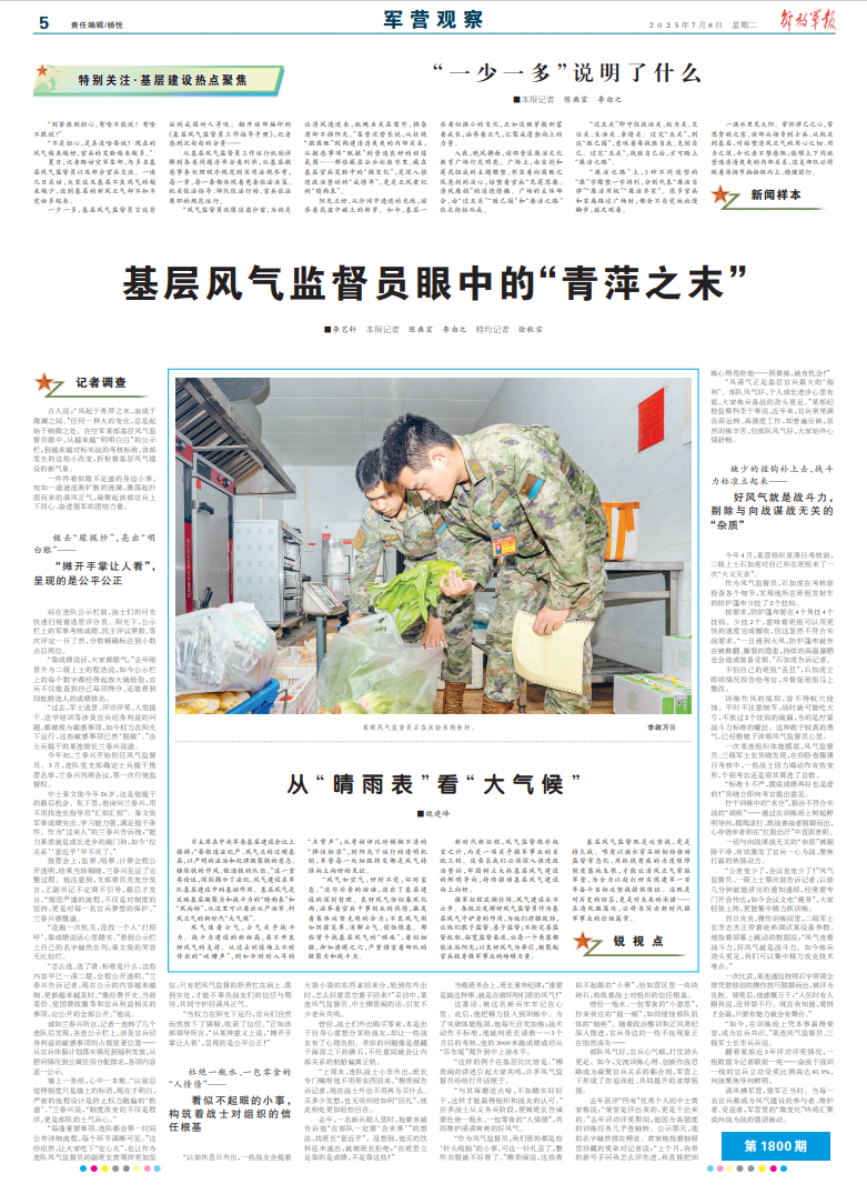 “作为风气监督员,我们管的都是些‘针头线脑’的小事,可这一针扎歪了,整件衣服就不好看了。”柳贵闽说,这些看似不起眼的“小事”,恰如营区里一块块砖石,构筑着战士对组织的信任根基。