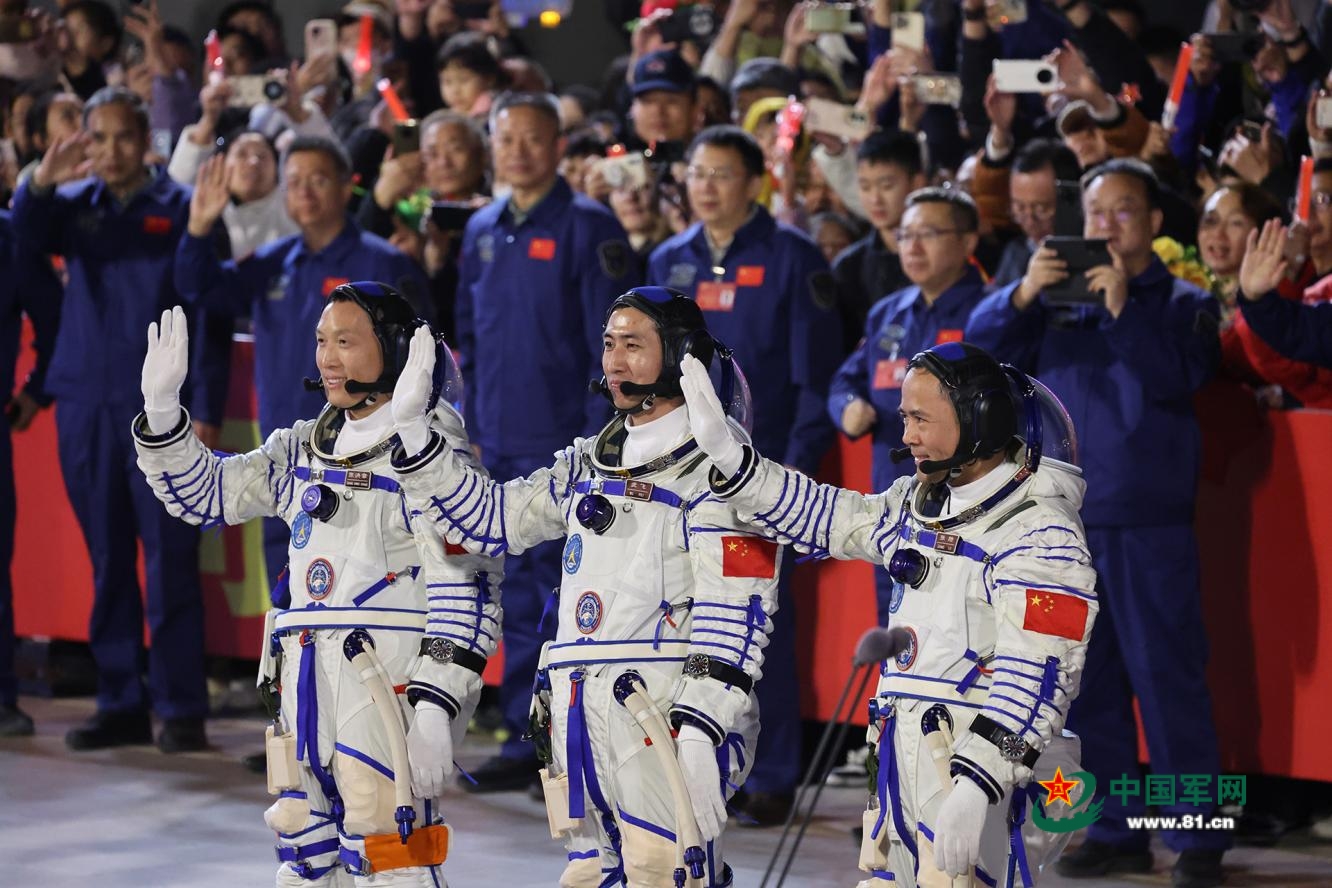 发射前三小时,三名航天员身着“飞天战甲”,再次踏上问天阁前的圆梦园广场。
