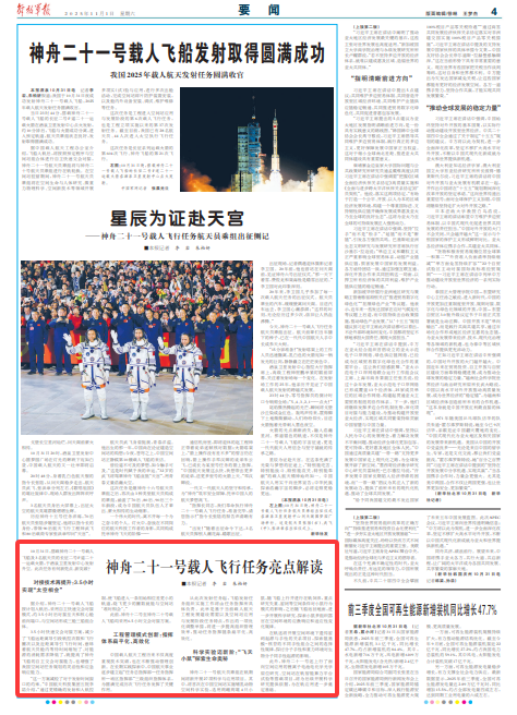 此外,神舟二十一号还上行了面向空间应用的锂离子电池电化学光学原位研究、空间站在轨智能算力平台试验等搭载项目,将为后续开展科学研究提供依据,为在轨应用进一步奠定基础。