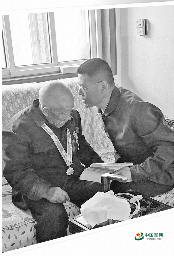 93岁的老兵陈崇义去年犯了两次脑血栓,让傅中魁非常挂念。看到傅中魁走进屋里,卧病在床的陈崇义费力地坐起身来。聊一会儿,老人倚着床头休息一会儿;聊到兴头上,身体就往前倾一倾。傅中魁拉着陈崇义的手,把身体贴到老人跟前,不厌其烦地一遍遍听他讲战斗故事。