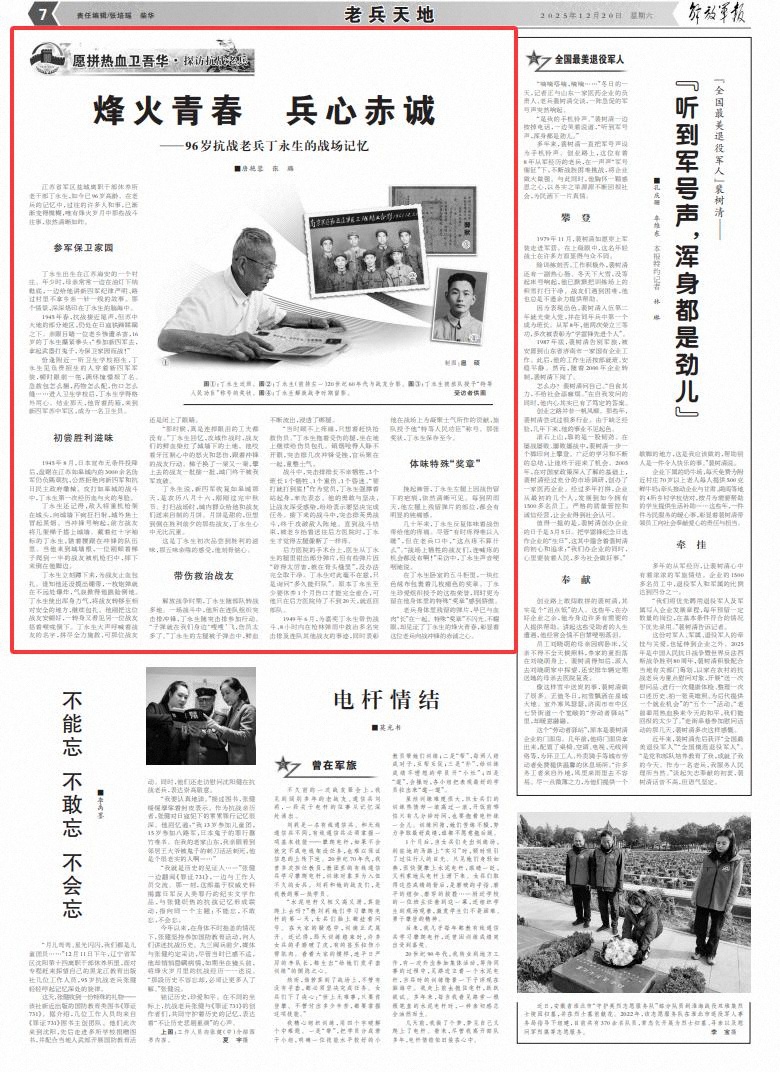 江苏省军区盐城离职干部休养所老干部丁永生,如今已96岁高龄。在老兵的记忆中,过往的许多人和事,已渐渐变得模糊,唯有烽火岁月中那些战斗往事,依然清晰如昨。