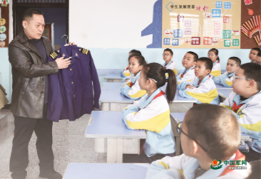 王茂森来到玛纳斯县第五小学,为学生们讲述军装背后的故事。