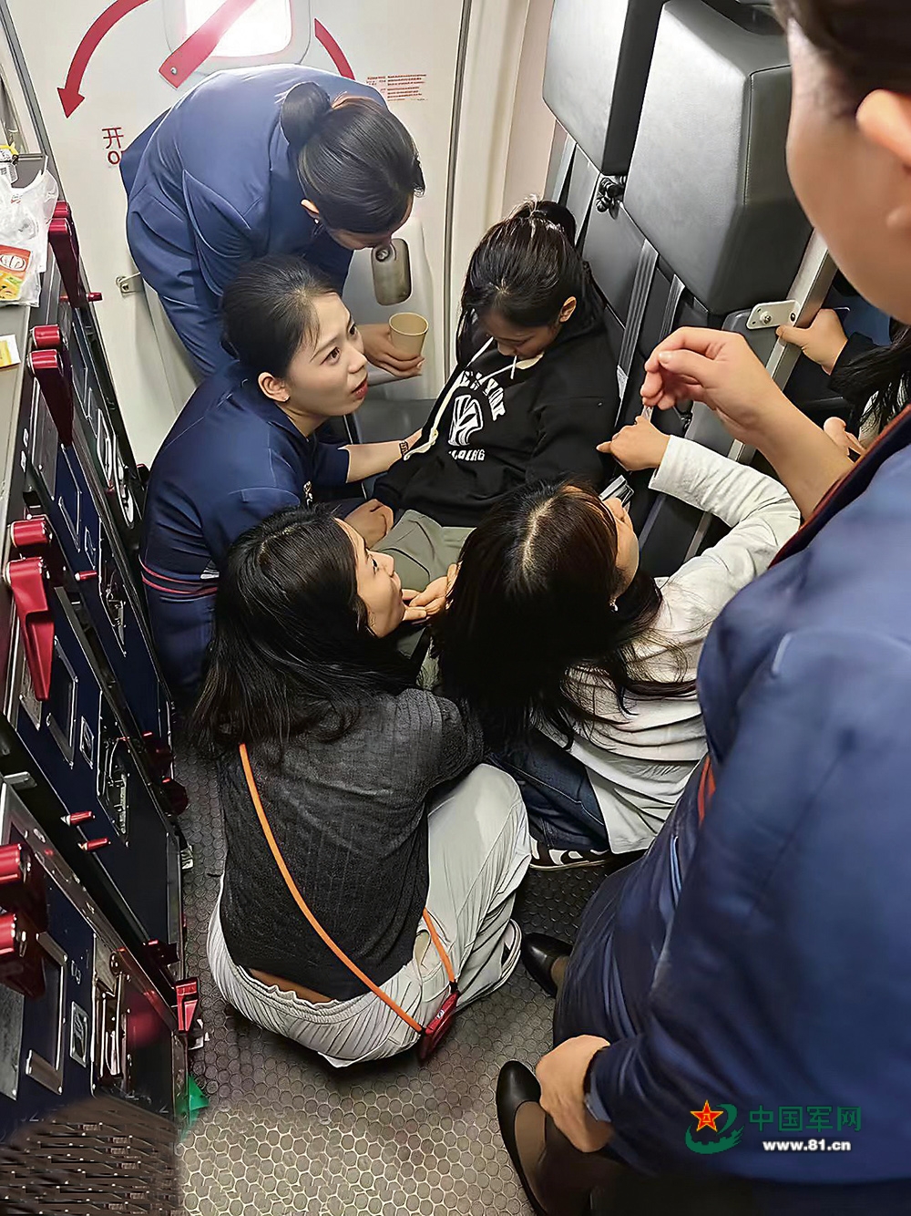 2月24日上午,徐艳丽(左下者)在机舱内为晕厥女孩进行诊断。受访者供图