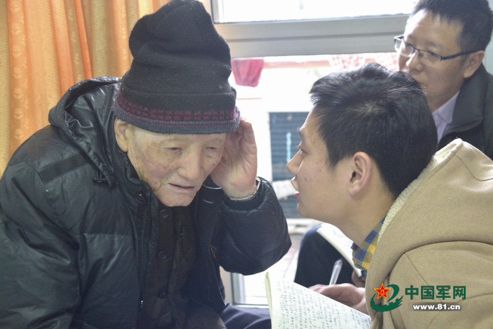 在浙江省宁波市,工作人员听抗战老兵鲍子文讲述战斗故事。莫 非摄