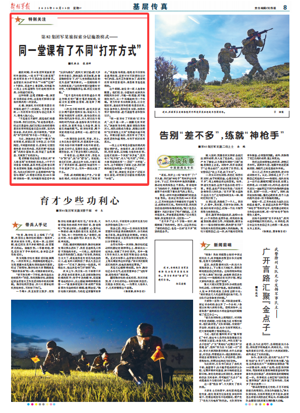 一级上士刘鹭是分层施教模式的坚定拥护者。在他看来,官兵年龄不同、经历各异、认知能力也存在差别,让他们在同一个课堂“齐步走”,显然有人“吃不饱”,有人“吃不消”。“平时,大家都诟病教育‘一刀切’‘大呼隆’,如今,这个问题有了破解之法,我们要做的就是如何进一步完善它。”
