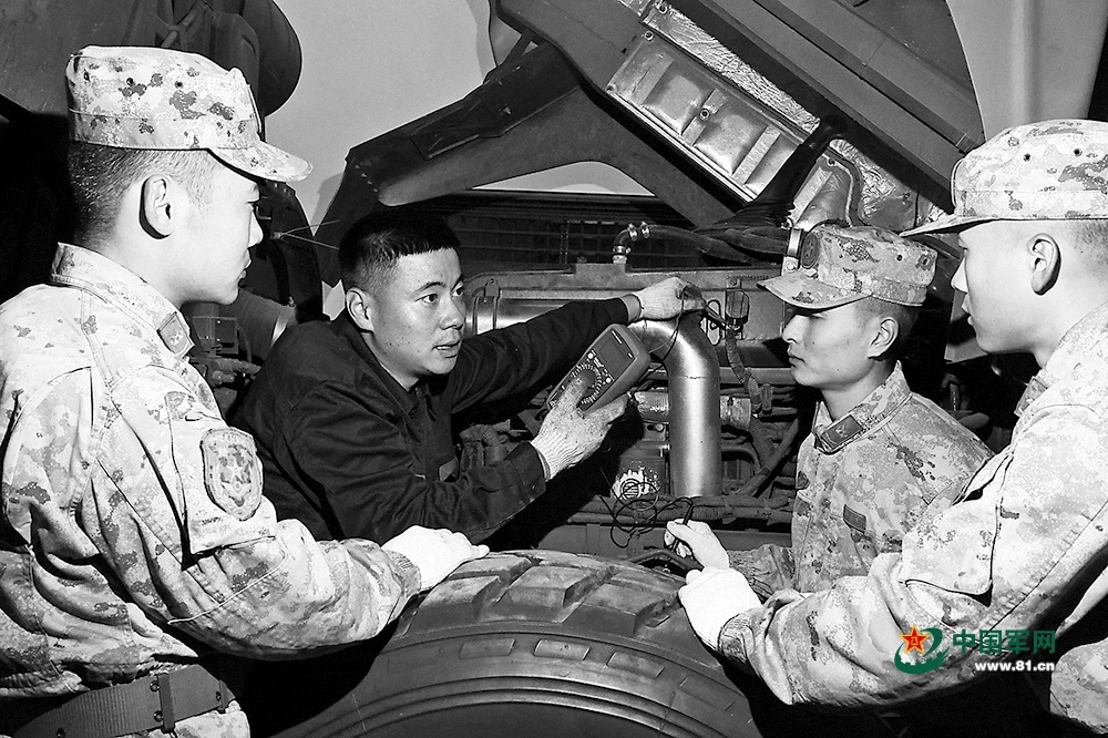 宋浩然(左二)给战友分析讲解装备故障问题。权体舒摄