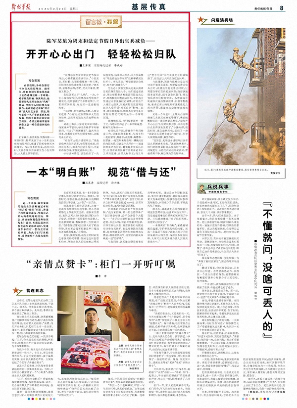 打卡景点、品尝美食、观看电影……前段时间,陆军某旅下士小张和战友相约请假外出,度过了轻松愉快的休闲时光。与以往不同的是,这次归队时,大家手里不再拎着大包小包的物品,人人脸上笑容舒展。