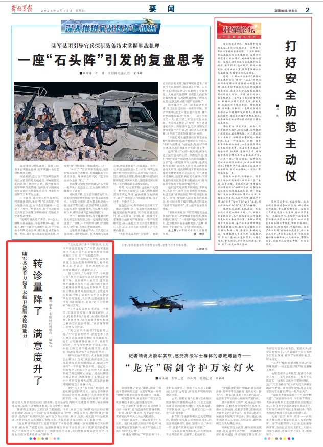该旅卫生连杨连长介绍,旅里探索建立卫生连服务保障能力提升机制以来,经过近一年的改进优化,官兵转诊量降了、满意度升了。