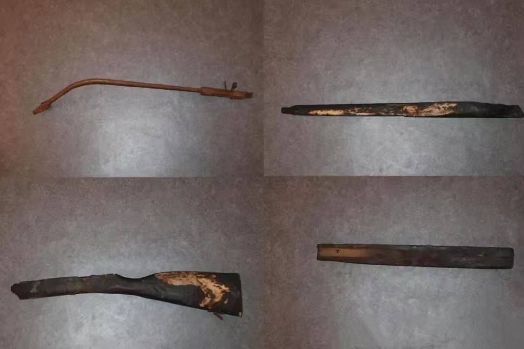 ▲“刘老庄连”的“传家宝”(捅弯的枪管、一副枪托、两段护木)