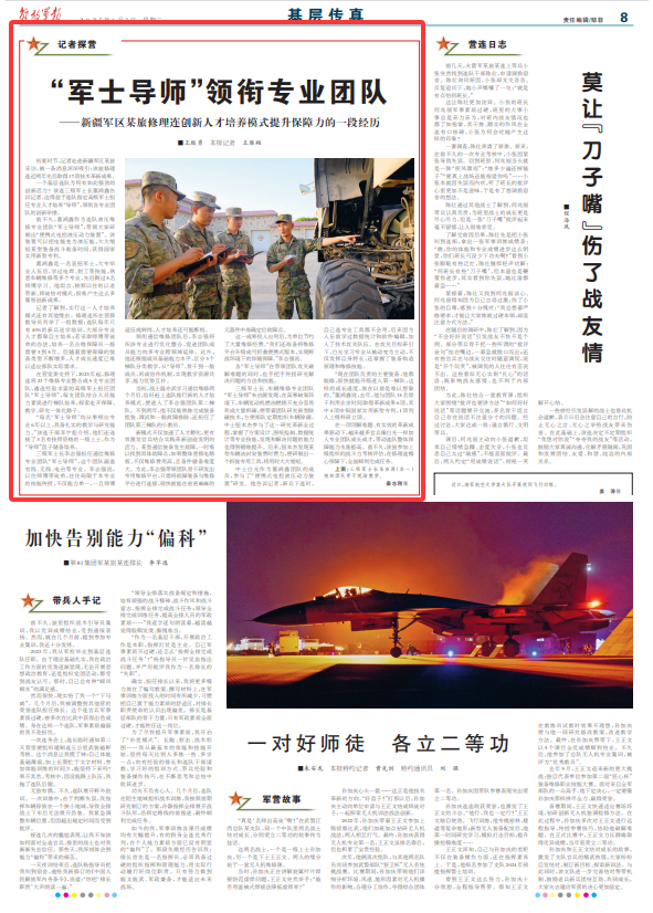 一个基层连队为何有如此强劲的创新活力?该连三级军士长董鸿鑫告诉记者,这得益于连队指定高级军士担任专业人才培养“导师”,领衔各专业团队的创新举措。