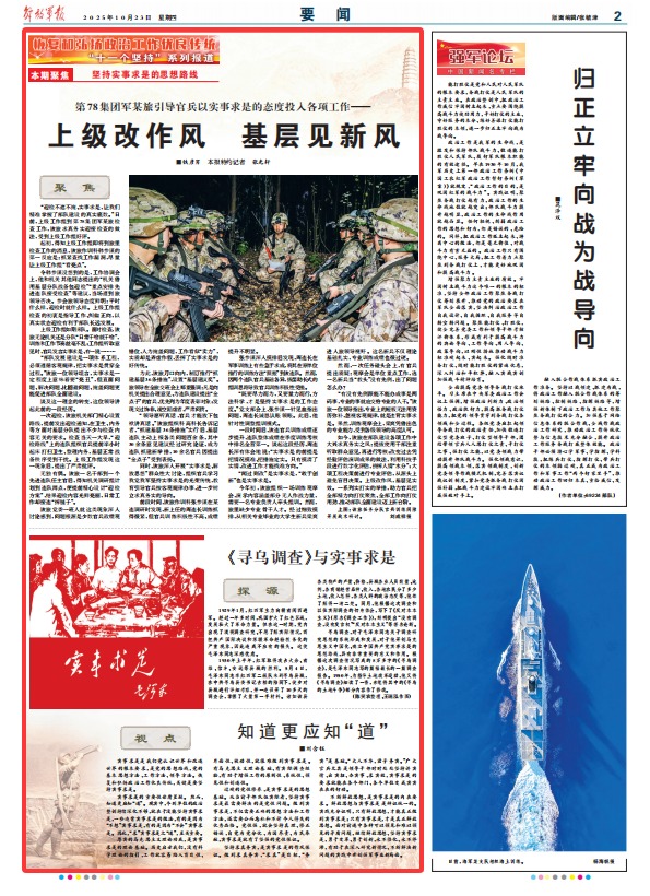 如今,该旅在部队建设各项工作中大兴求真务实之风:提拔使用干部注重听取群众意见,再进行考核;改变过去凭经验评估演训成果的做法,利用科技手段进行数字化评估,挤掉人情“水分”;大项工程决策前进行专业评估,从源头上避免盲目决策。上级改作风,基层见实效。一系列实打实的举措,助力官兵把全部精力向打仗聚焦、全部工作向打仗用劲,推动部队全面建设迈上新台阶。
