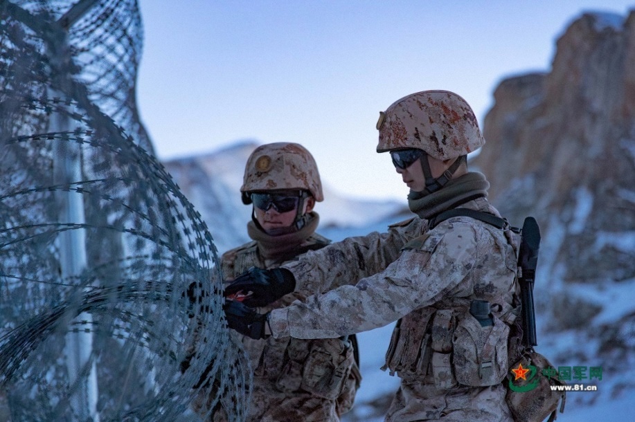 官兵在巡逻途中修缮铁丝网。马文清 摄