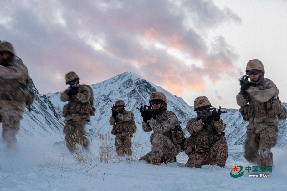 官兵在巡逻途中开展战术训练。马文清 摄