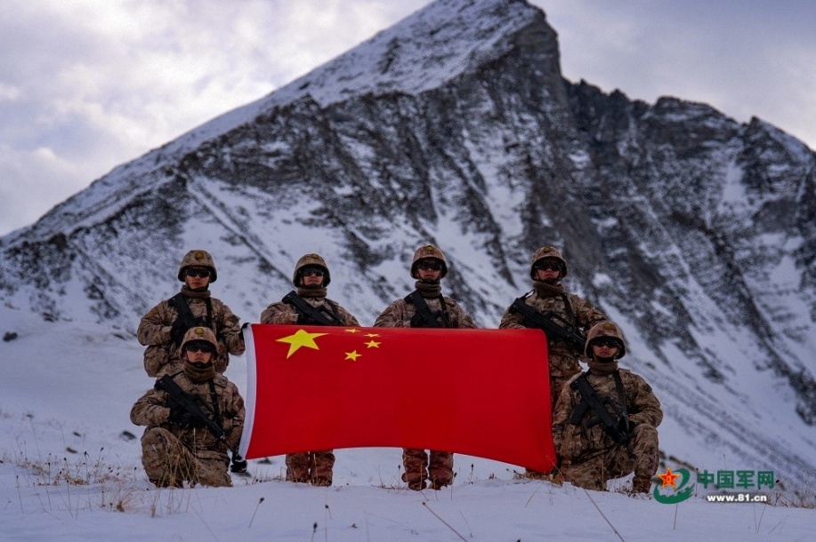 抵达目的地后,巡逻官兵与国旗合影。马文清 摄